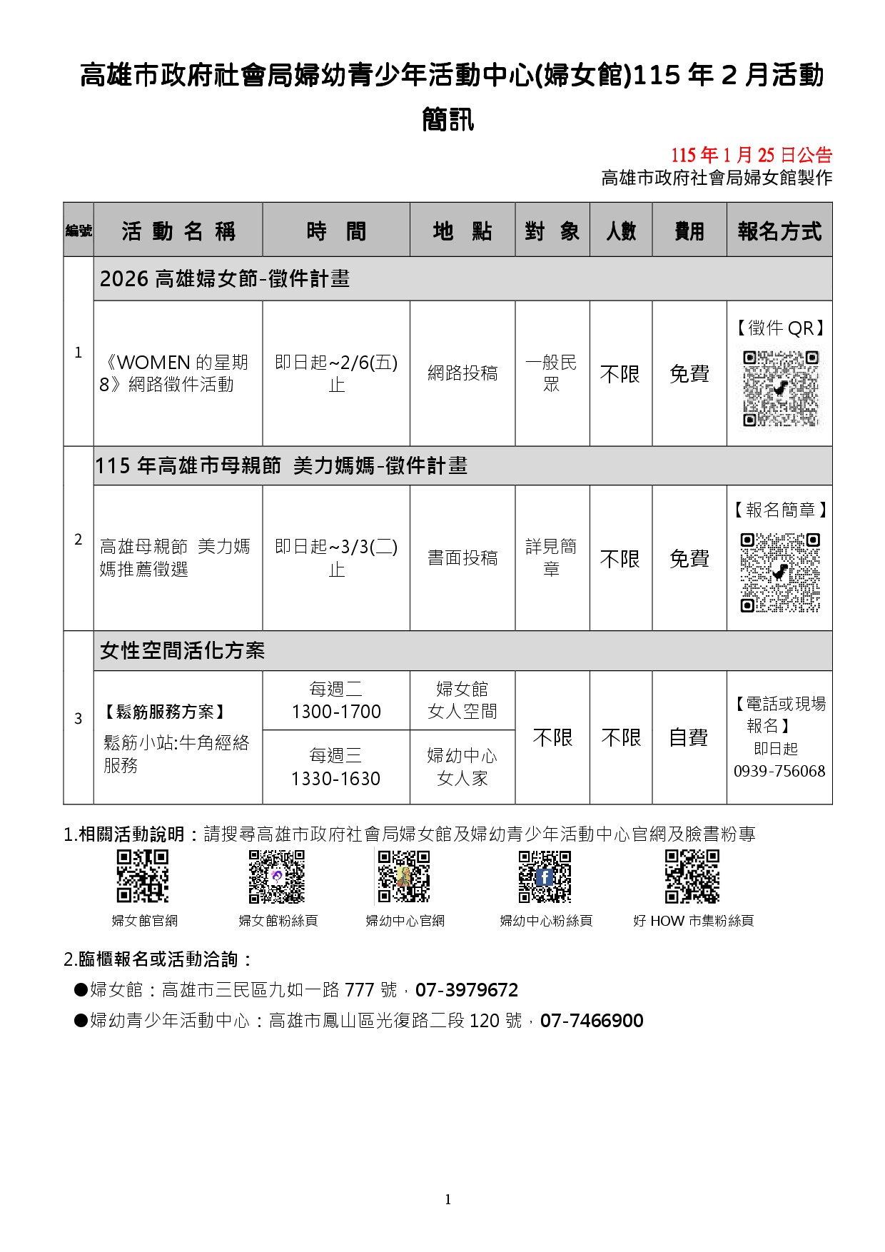 高雄市政府社會局婦幼青少年活動中心(婦女館)115年1月活動簡訊(1/25更新) 參加活動,打開你的生活圈!歡迎大家一起來報名! 洽詢電話:婦女館:07-3979672;婦幼青少年活動中心:07-7466900 線上報名網址: 【2026高雄婦女節-徵件計畫《WOMEN的星期8》網路徵件活動】 【115年高雄市母親節 美力媽媽-徵件計畫推薦徵選】